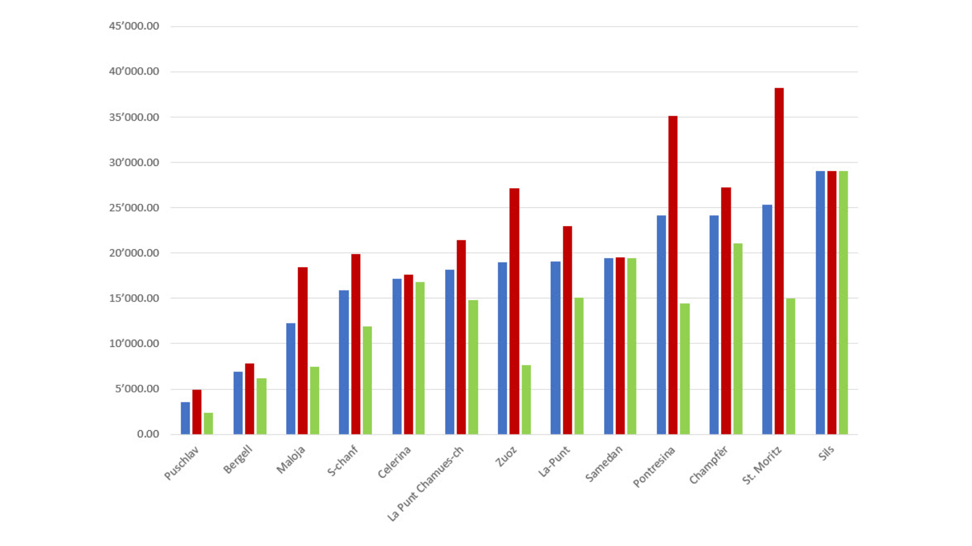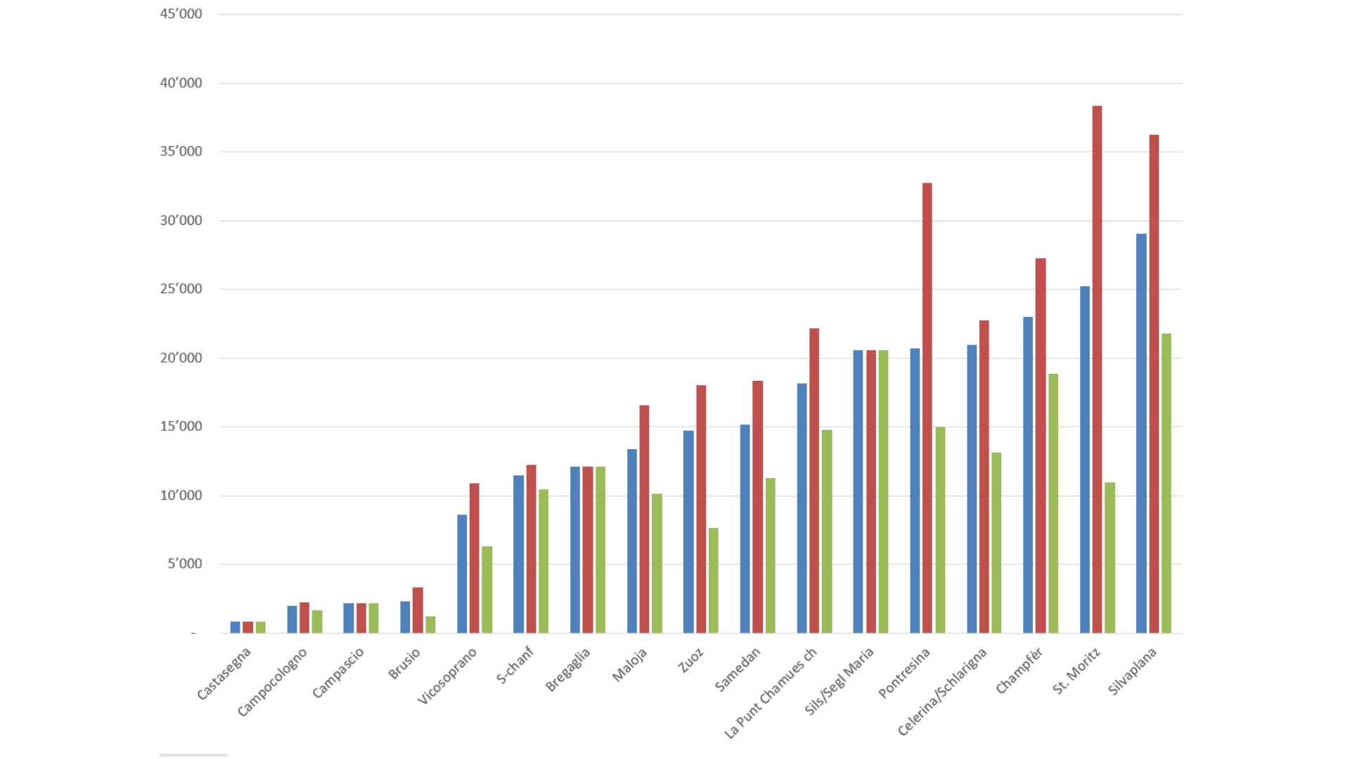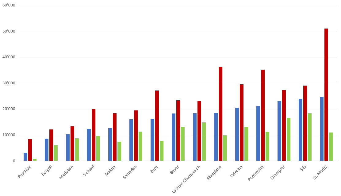 Die Grafik ordnet die durchschnittlichen Quadratmeterpreise aufsteigend nach Gemeinden. Dabei bleibt St. Moritz über das gesamte Jahr gesehen die Gemeinde mit den höchsten Durchschnittspreisen, dicht gefolgt von Sils, Champfèr, Pontresina und Celerina.