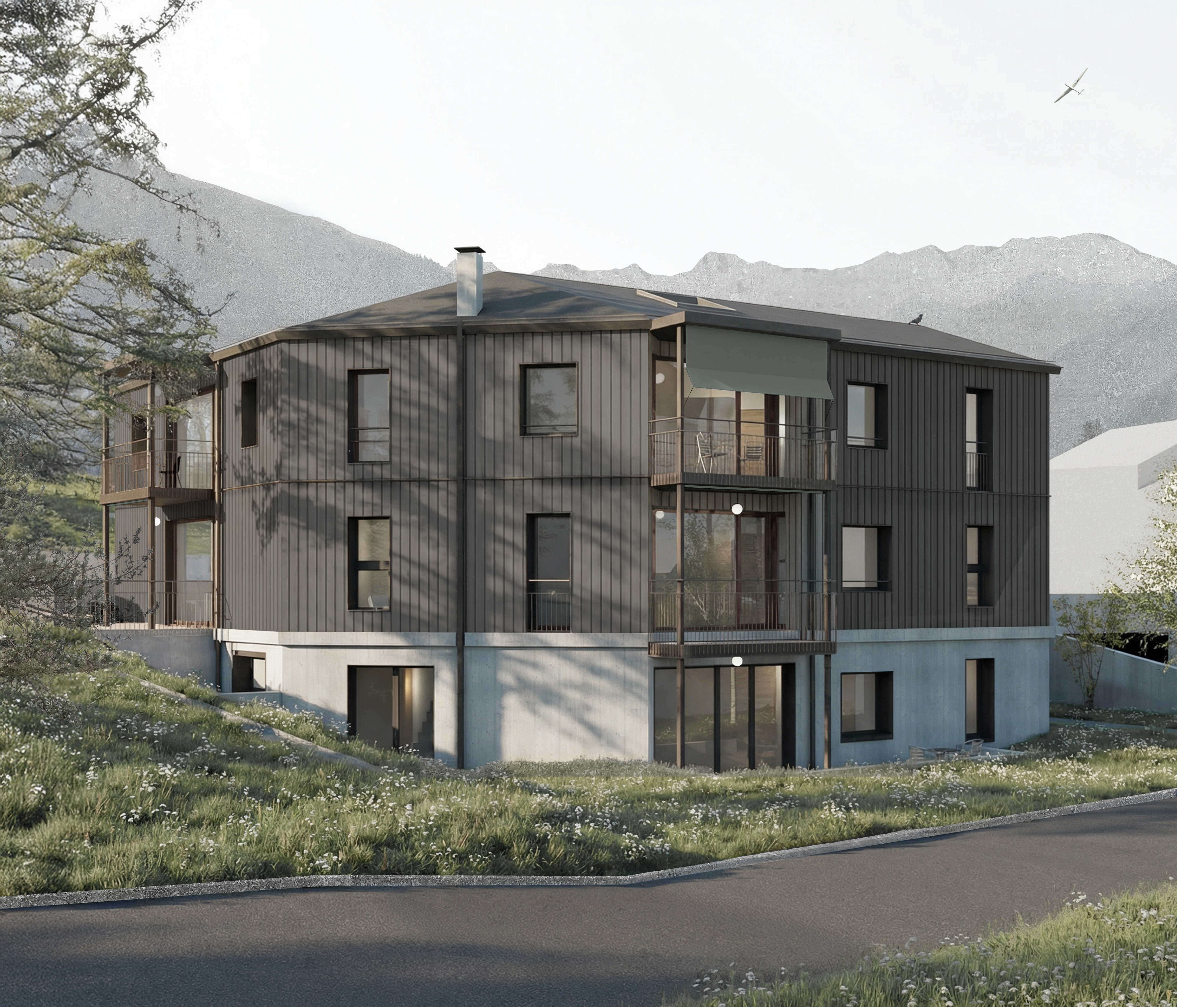 Der Neubau, bestehend aus zwei verbundenen Baukörpern, beinhaltet insgesamt 9 Wohneinheiten. Mit 5 Zweit- und 4 Erstwohnungen besteht eine ausgewogene Gemeinschaft zwischen Ein- und Zweitheimischen.